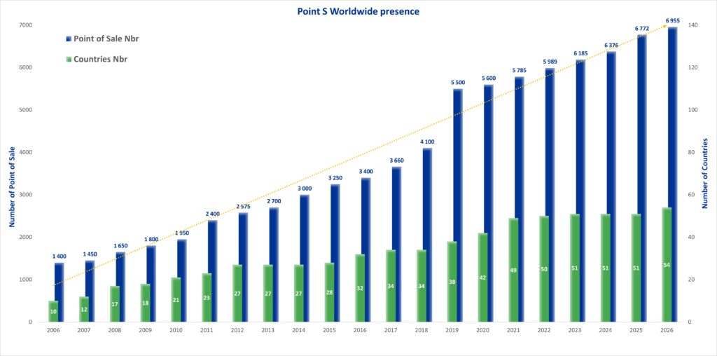 En la actualidad, Point S es, más que nunca, una red internacional con presencia en más de 54 países y más de 6,955 puntos de venta en todo el mundo.